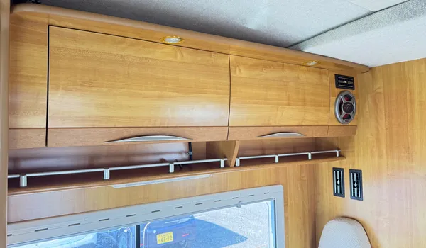 キッチン上部に設けられた木目調の大容量キャビネット。食器や調理器具、小物類をすっきり収納でき、車内を広く使えます。棚も備わっているので、よく使うものはサッと取り出せます。