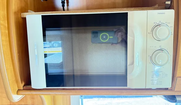 車内に備え付けの電子レンジ。飲食店が閉まった深夜でも、道の駅やキャンプ場で温かい食事を手軽に用意できます。小さなお子さまの離乳食の温めにも便利です。
