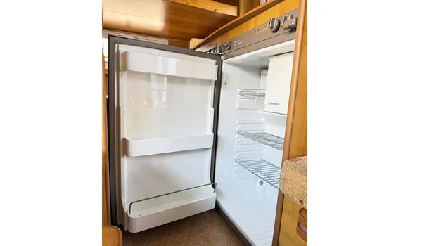 たっぷり収納できる大型冷蔵庫。ドアポケットや棚板でしっかり整理でき、数日分の食材や飲み物もまとめて保管可能。静音設計で就寝中も音が気になりません。