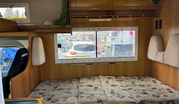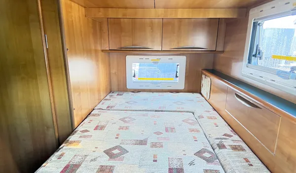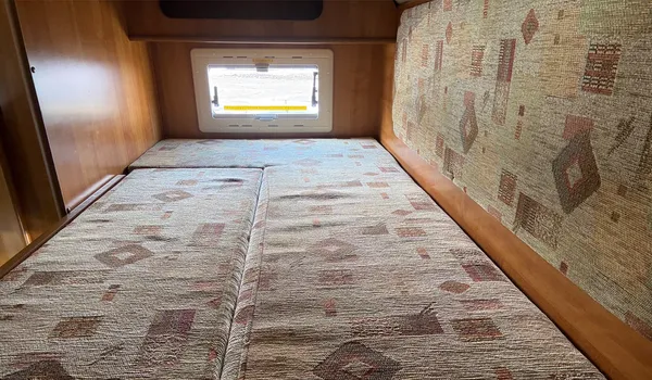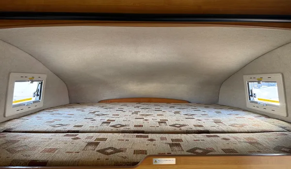車両後部に常設されたベッドスペース。セッティング不要でいつでもすぐに横になれるため、長距離ドライブの疲れもすぐに癒せます。窓付きで換気も良好です。