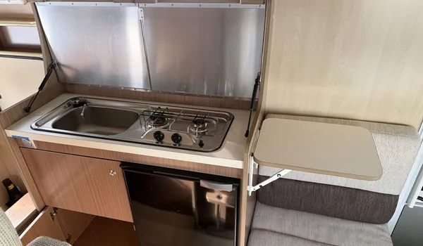 The kitchen area consolidates all essential functions in one place, allowing efficient use of space and making meal preparation on the road more enjoyable.