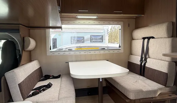 A relaxing dinette by bright windows, perfect for meals and breaks during your journey.