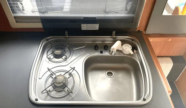 Equipped with faucet, sink, and two gas burners, plus a fold-out side table to extend cooking space and improve comfort.