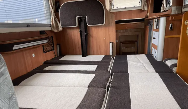 The large dinette seats up to six people and quickly converts into a spacious bed (~900 mm × 1,900 mm) by folding the seats.