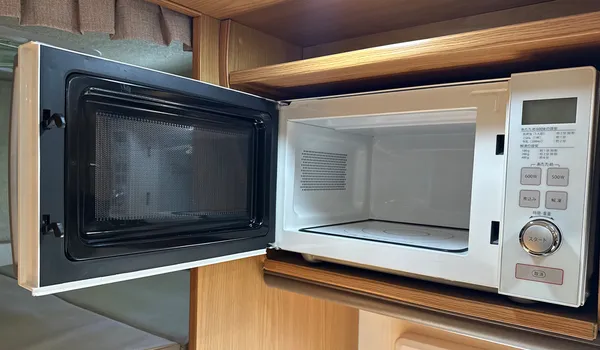 The built-in microwave allows for quick heating and simple meal preparation.