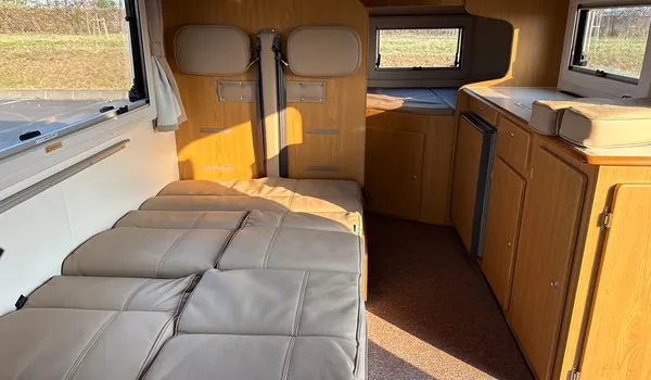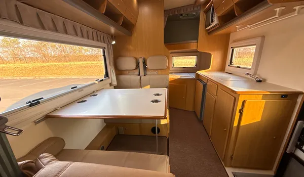 With large windows, a practical table, and comfortable beds, the interior layout ensures a pleasant experience both while driving and during stays.