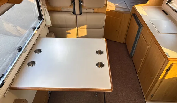 A stable dinette with a table and cup holders, ideal for meals and breaks inside the vehicle.
