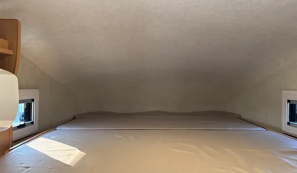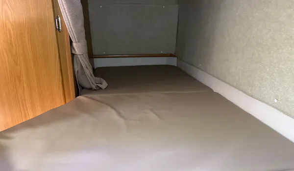 A spacious cab-over bed above the driver’s seat, useful both for sleeping and as extra storage.