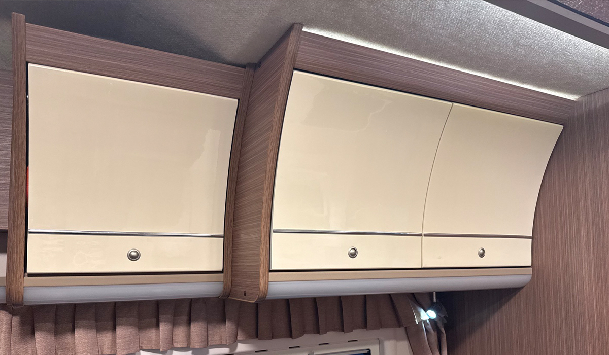 車内上部には、ゆるやかなカーブが特徴の吊り戸棚を配置。深さのある収納力で、衣類や小物類をすっきり整理できます。