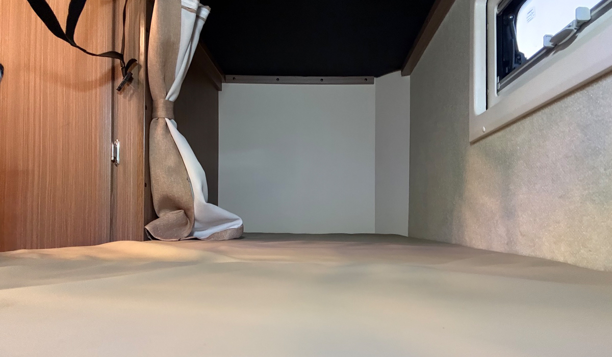 運転席上はフラットな就寝スペースになっており、大人でも横になれる十分な広さがあります。左右の小窓から光が入り、閉塞感を抑えた空間です。