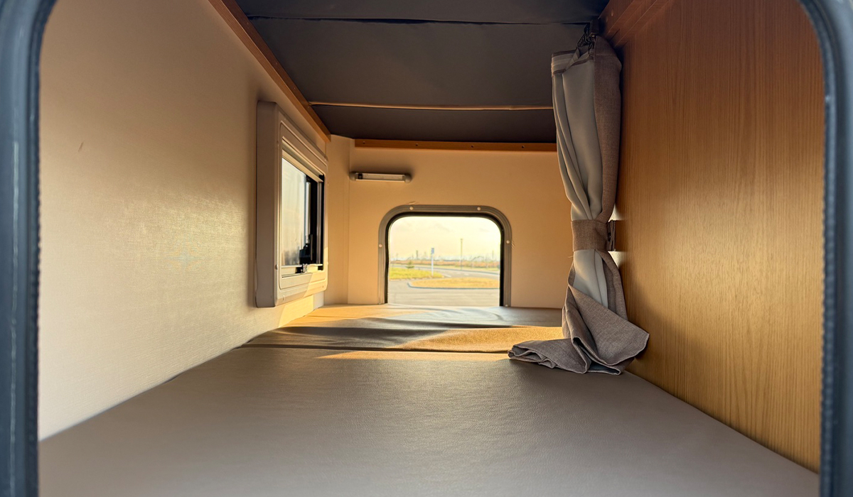 大きな窓や使い勝手の良いテーブル、しっかり休めるベッドなど、移動中も滞在中も快適に過ごせる車内レイアウトが整っています。